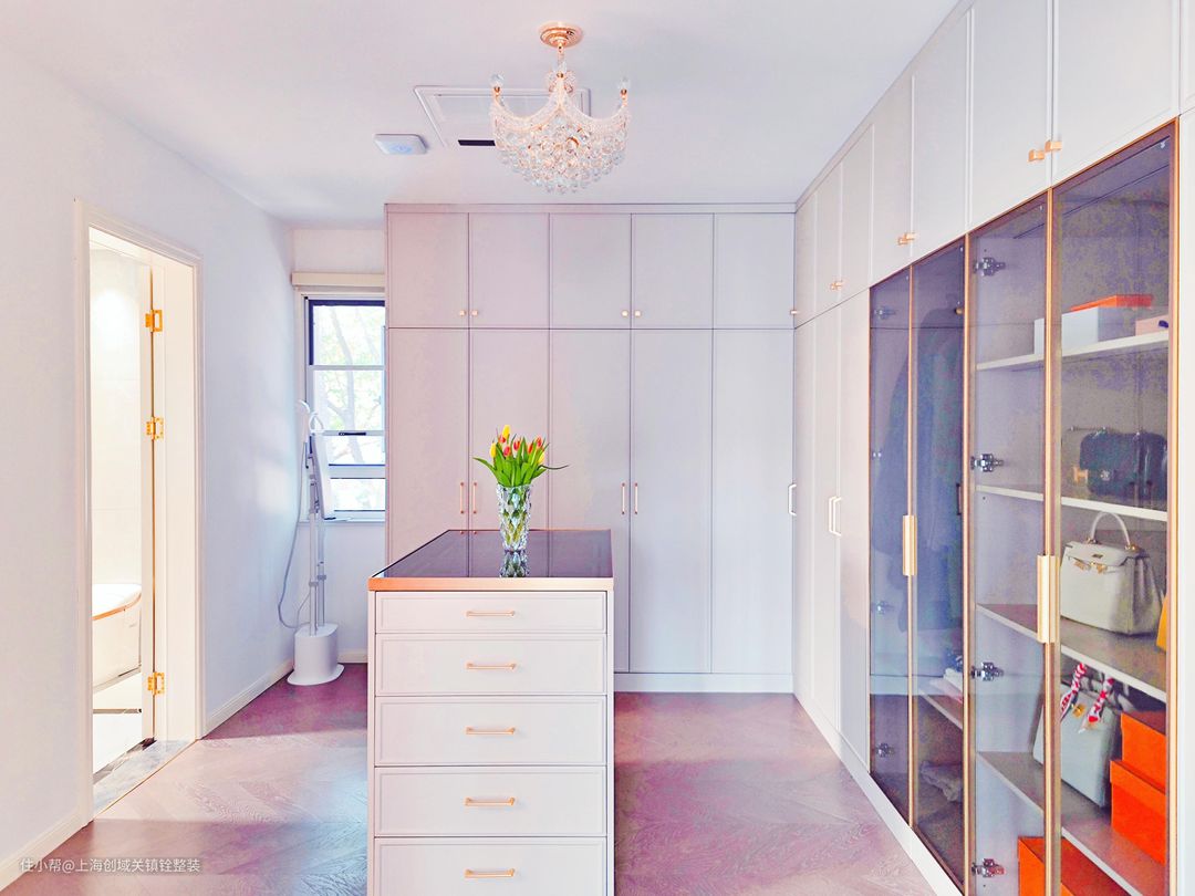 打通后的衣帽间用隐形门的方式做了区域划分,而在打通后的剩余空间中,设计师也没将其浪费,直接改造成了独立的化妆间。 收纳上,设计师从男女屋主的衣物需求量上考虑,在一侧打满柜,满足了一家人的储物需求,同时柜体与台面做一体化设计,将空间利用到极致的同时,让整个衣帽间看起来更完整大气。