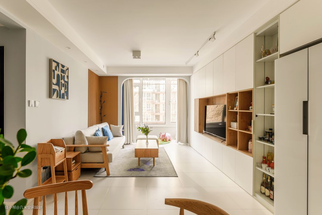 【电视墙】 1、新建次卧墙体后利用L型墙设计整墙组合式电视柜,开放格与通顶柜满足了杂物收纳、展示用等多重功能; 2、在于玄关屏风相连处的凹型,依据冰箱尺寸严丝合缝做嵌入,提高整体性,更加干净明亮也显大。