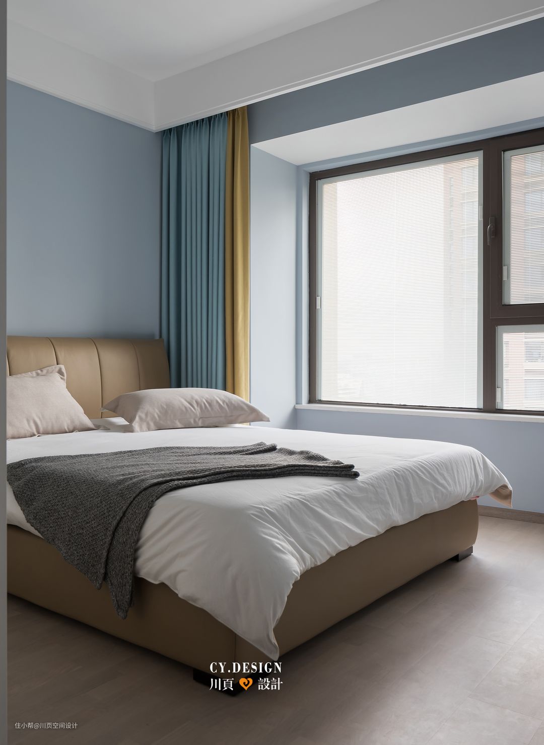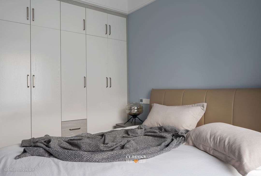 客卧的主色是灰蓝色,搭配卡其色皮艺床轮廓简单,轻简地搭配,更为舒适;蓝色相间的窗帘更是与墙色和家具做了呼应,让空间协调统一;