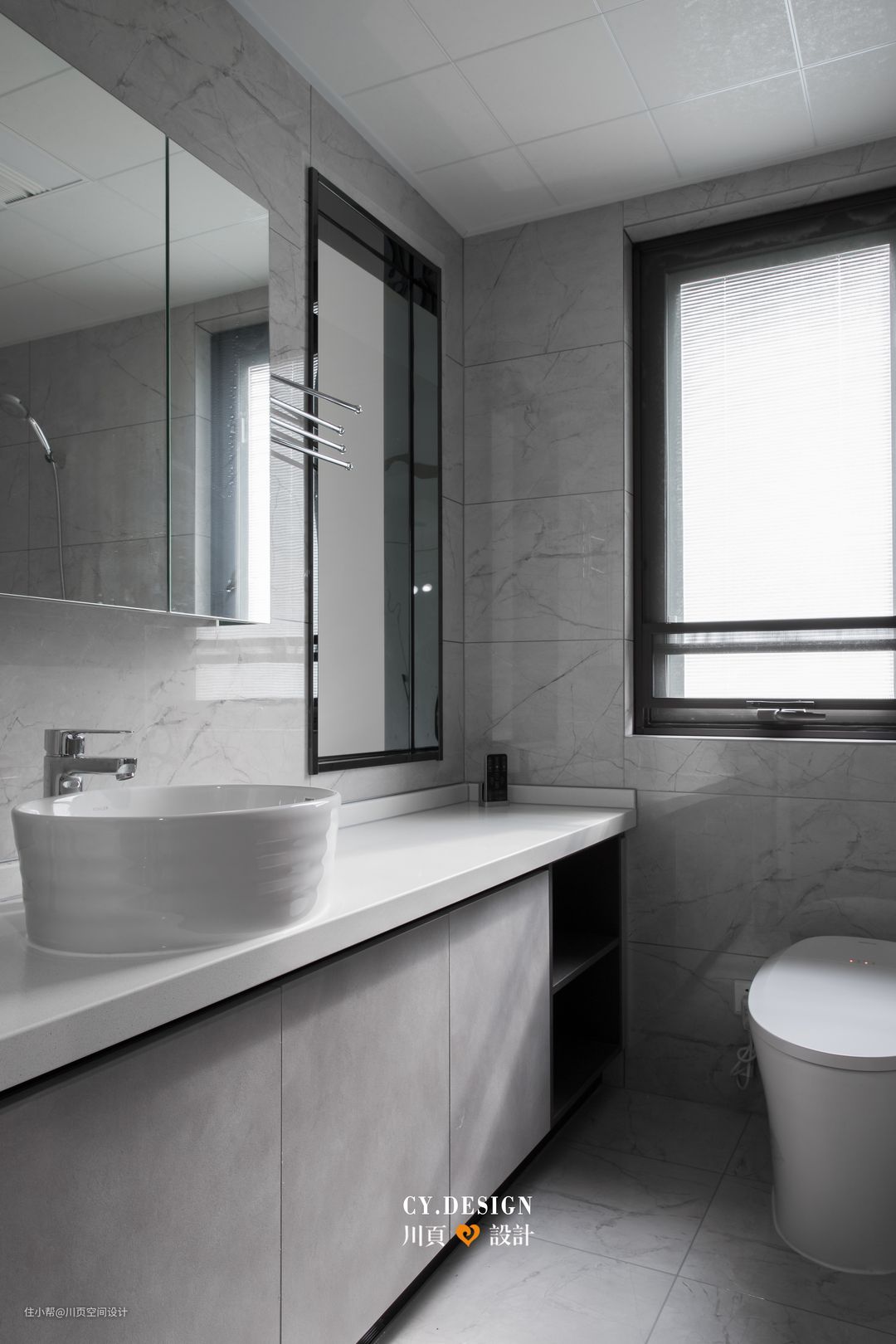 此卫以浅灰色为主色调,灰色墙砖与地砖,搭配灰色柜子,整个空间自成一体。
