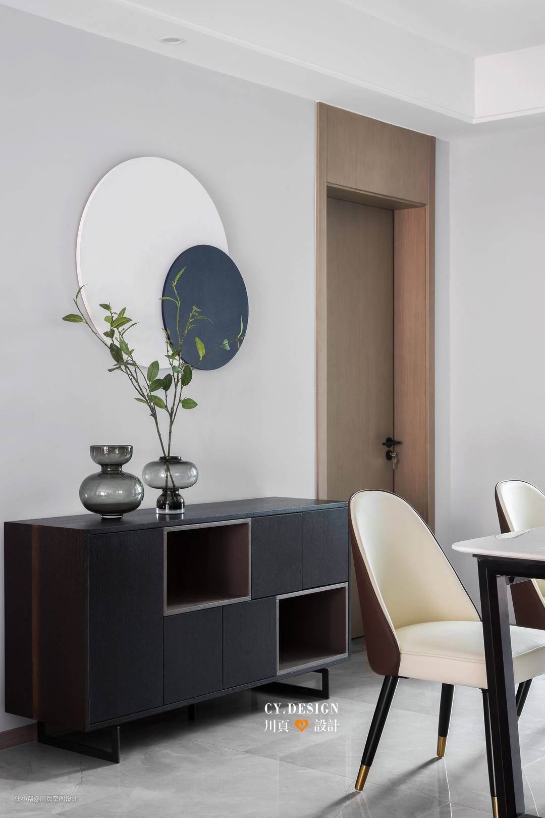 餐厅空间结构方正,规整的线条设计,让整个空间看起来更加开阔,浅灰的墙色搭配木色的房门,让黑白灰的空间中增加一份暖意,但是暖而不腻。
