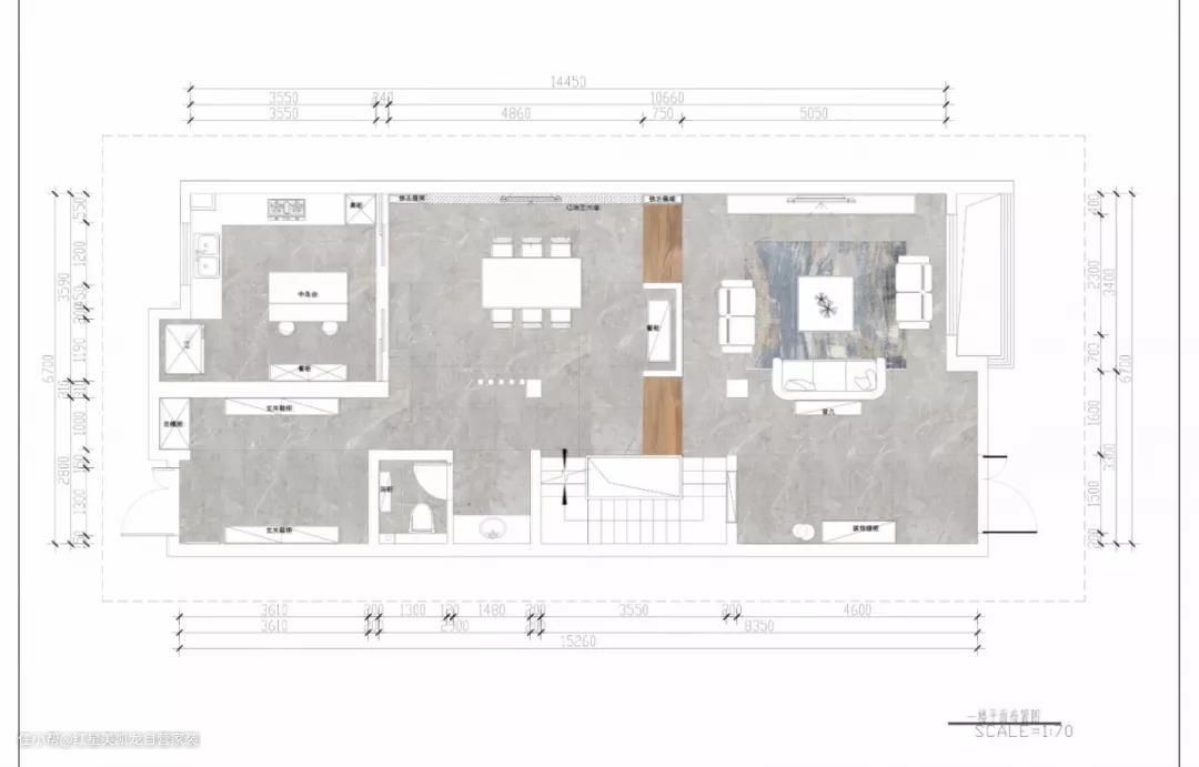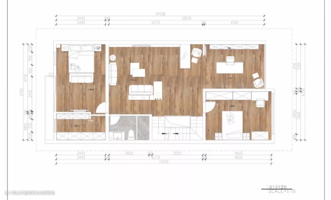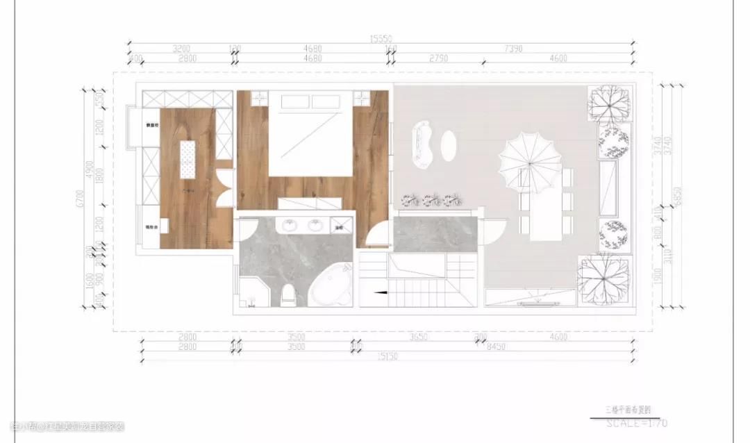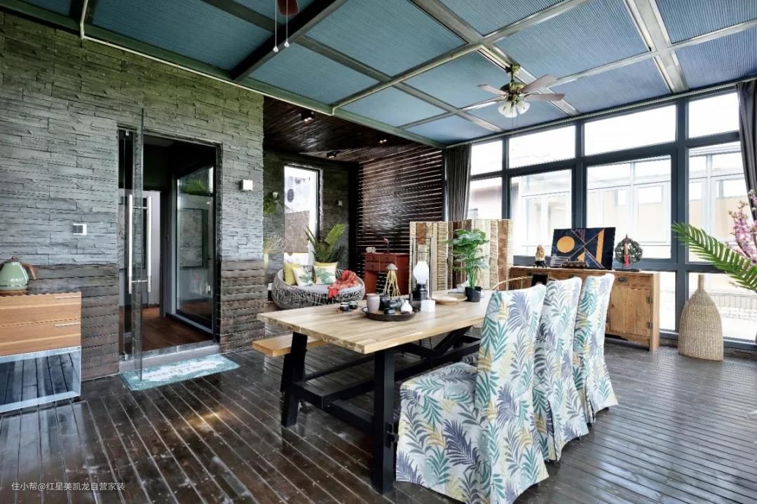 亮点:选用防腐木充分考虑到了露台位置的特殊性,增加了材质的使用寿命;电动遮光帘的设置为日常增添了科技之美,吊扇灯可以大大促进空调制冷的效果。