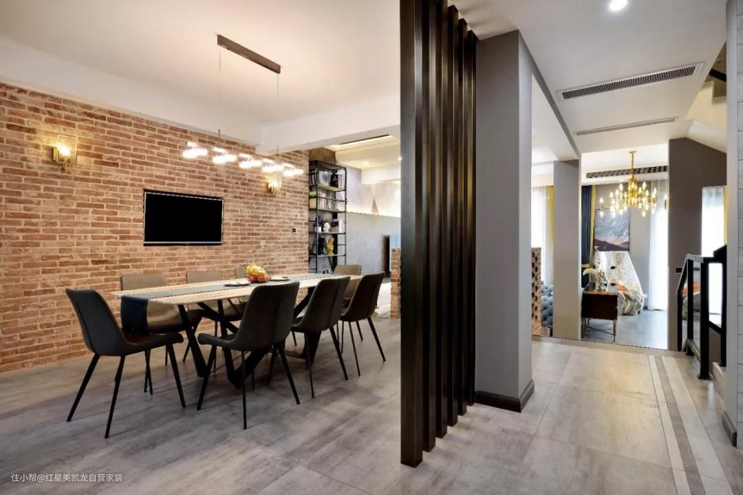 下沉式客厅,半高的红砖背景墙,即不影响餐厅方向过来的视觉效果,又起到了遮挡直接从台上直接俯冲下来的压迫感。
