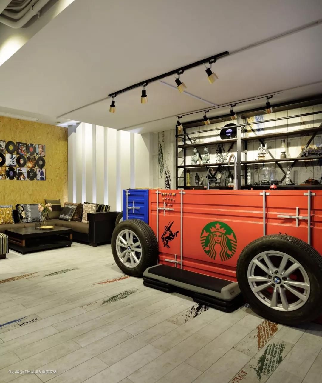 工业风的狂野,在地下室的设计中体现的淋漓尽致。集装箱造型的水吧台,豪放不羁,铁椅装饰的酒架,毫不矫揉造作,整个空间随性洒脱。
