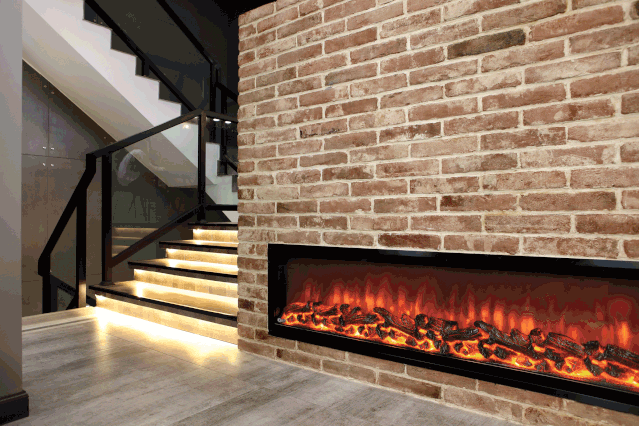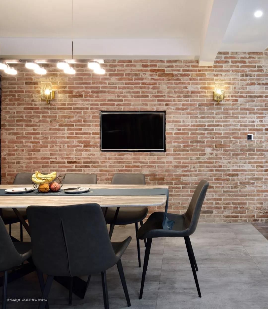 壁炉嵌入在餐厅平台下面的红砖墙内,复古而有年代感,让粗犷的工业风之中增添了暖意。