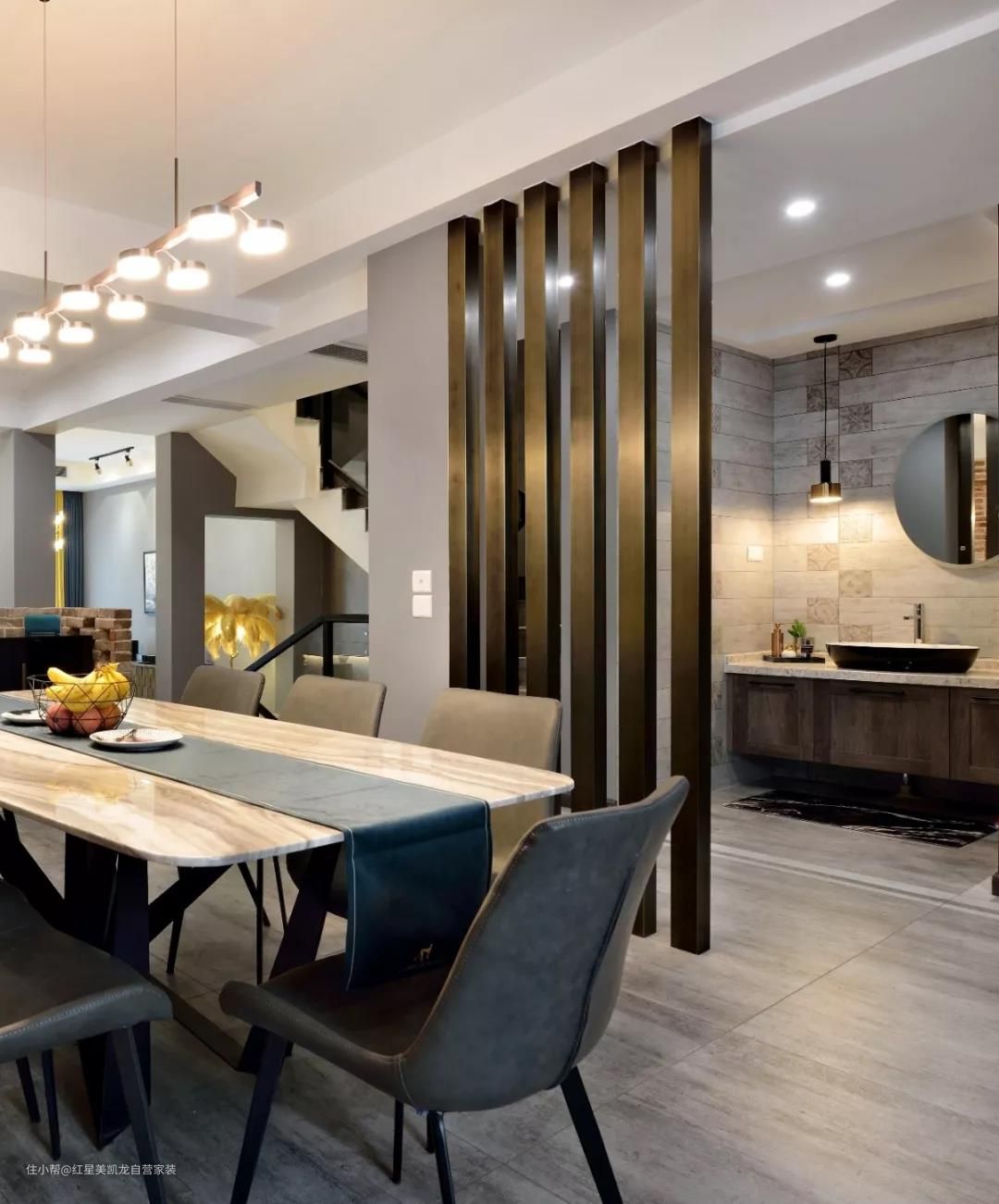 拉丝古铜色铝方管隔断,划分过道与餐厅的分区,同时划分了干湿区域,镂空的设计把隔断做成了空间的装饰之笔。