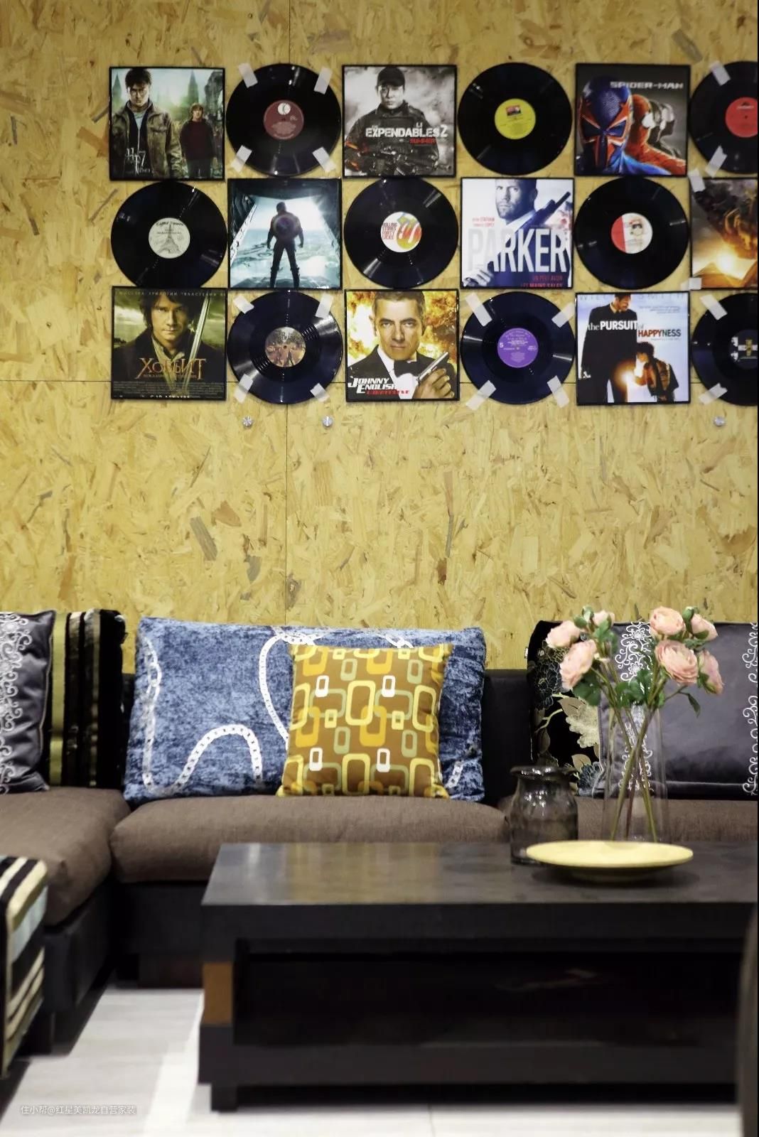 石膏板柱子造型墙面,搭配射灯营造立体感,欧松板直接上墙,加上复古电影胶片,让工业风的空间更为别致有味道。