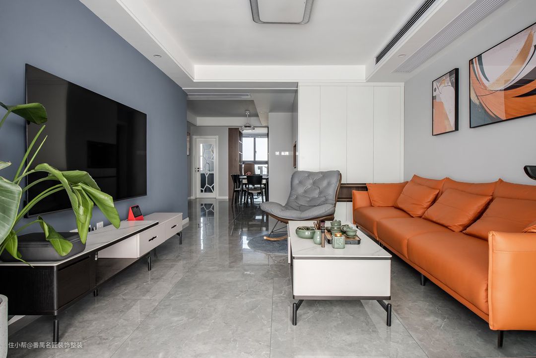 客厅只有黑白灰的颜色会显得比较单调,橙色沙发的加入让整空间都鲜活了起来,根据沙发的颜色选择搭配的挂画,搭配出的效果非常不错。