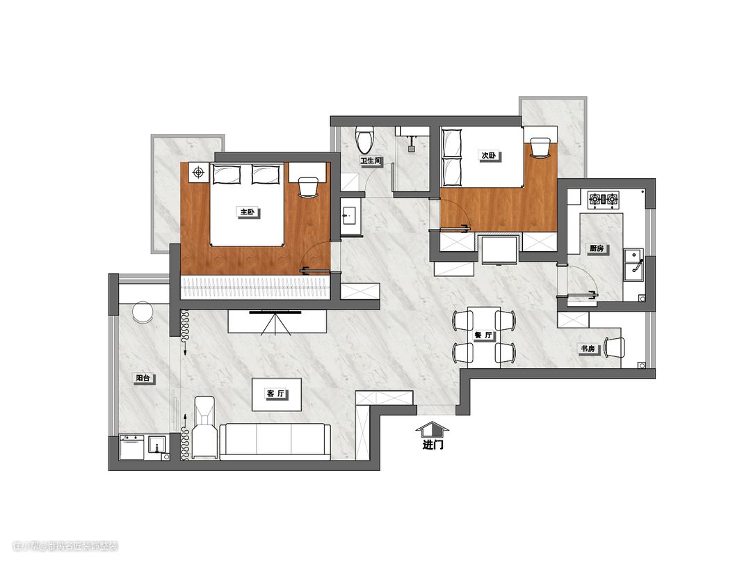 原始户型解析: 1.两个卧室和卫生间的门口距离太近了,走廊的空间很小,走路不太方便。 2.北阳台的空间没有利用起来。