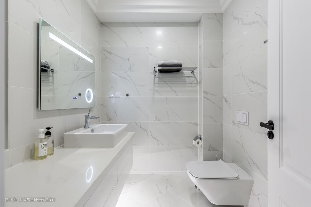 主卧卫生间以白色的大理石瓷砖通铺墙面和地面,顶部射灯、LED化妆镜+底部灯带,让卫生间保持舒适亮堂。选用了壁挂式马桶和悬挂式浴室柜,底部留空方便卫生清洁。