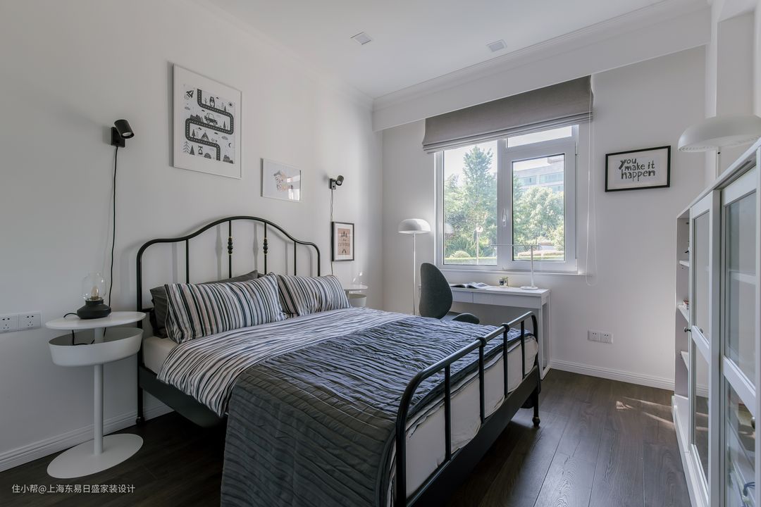 床尾靠墙添加整体橱柜,中间做玻璃橱柜,两侧做开放式厨房里,放置孩子喜欢的玩具和书籍。多处装饰画的放置也空间不再显单调。靠窗添加简易的学习书桌,保证孩子白天学习时,舒适的自然光线。