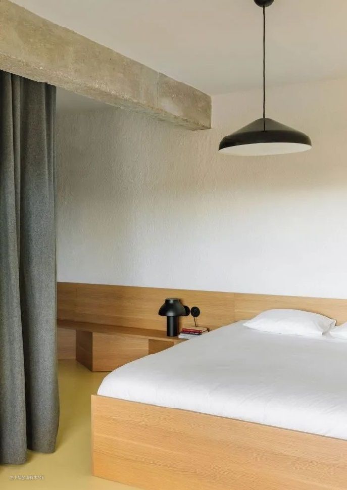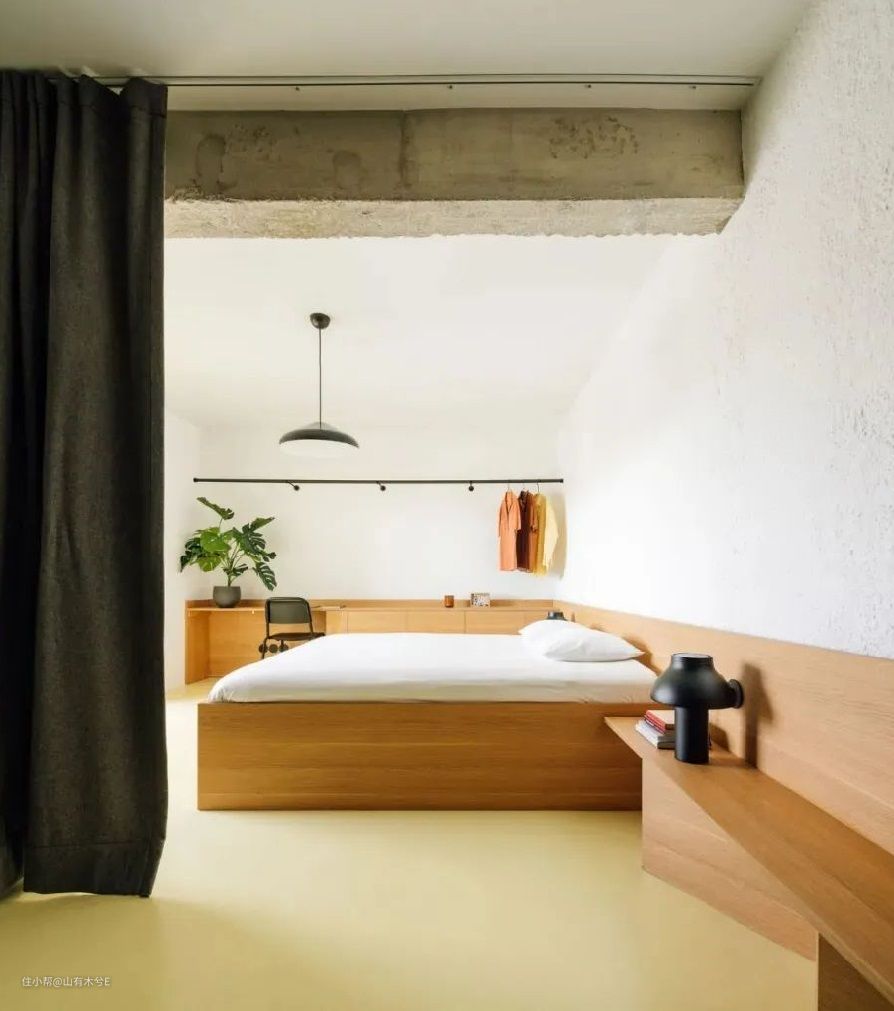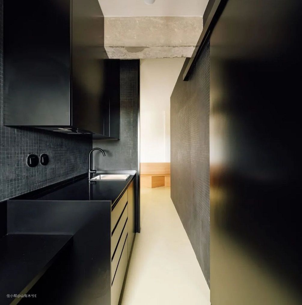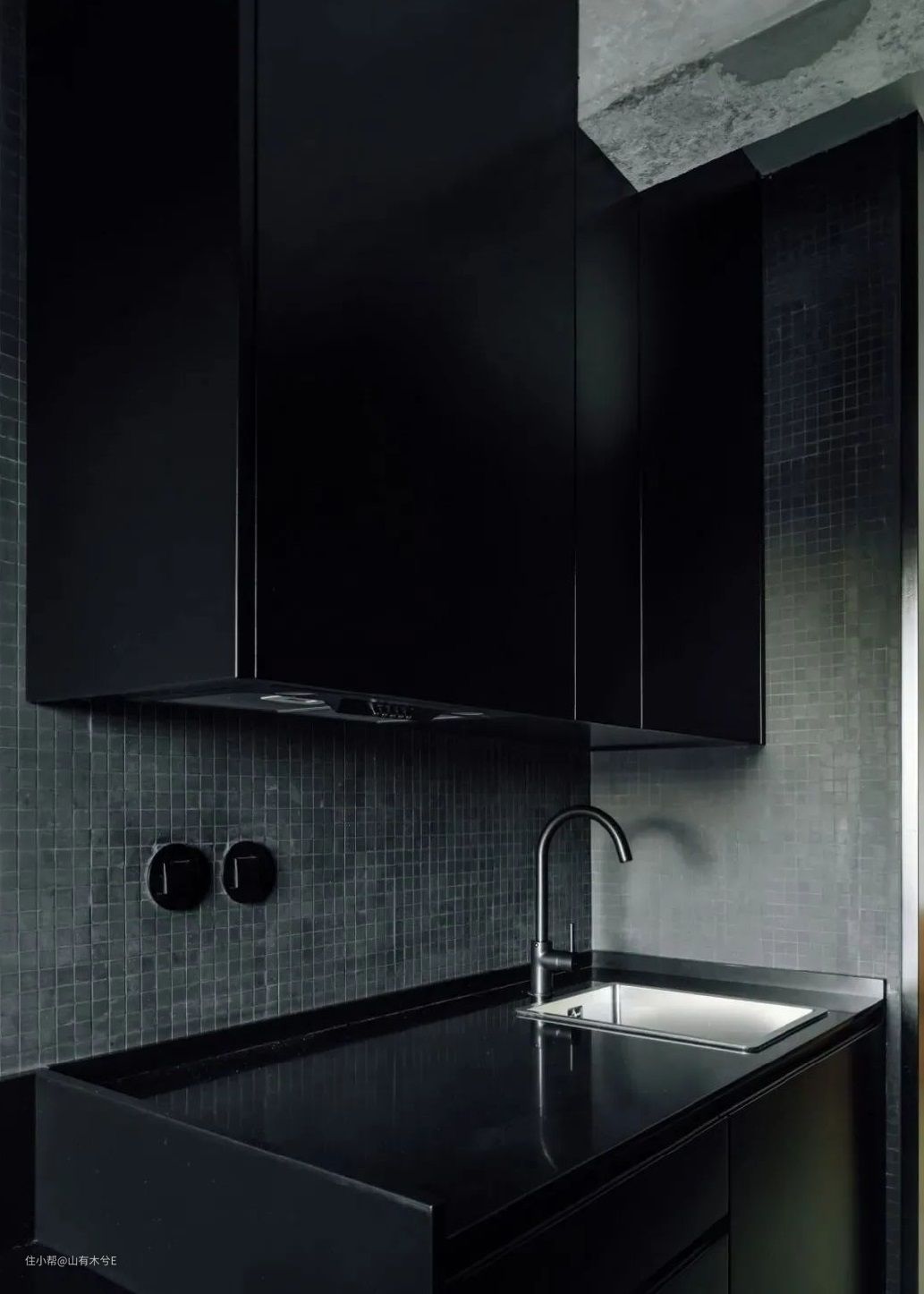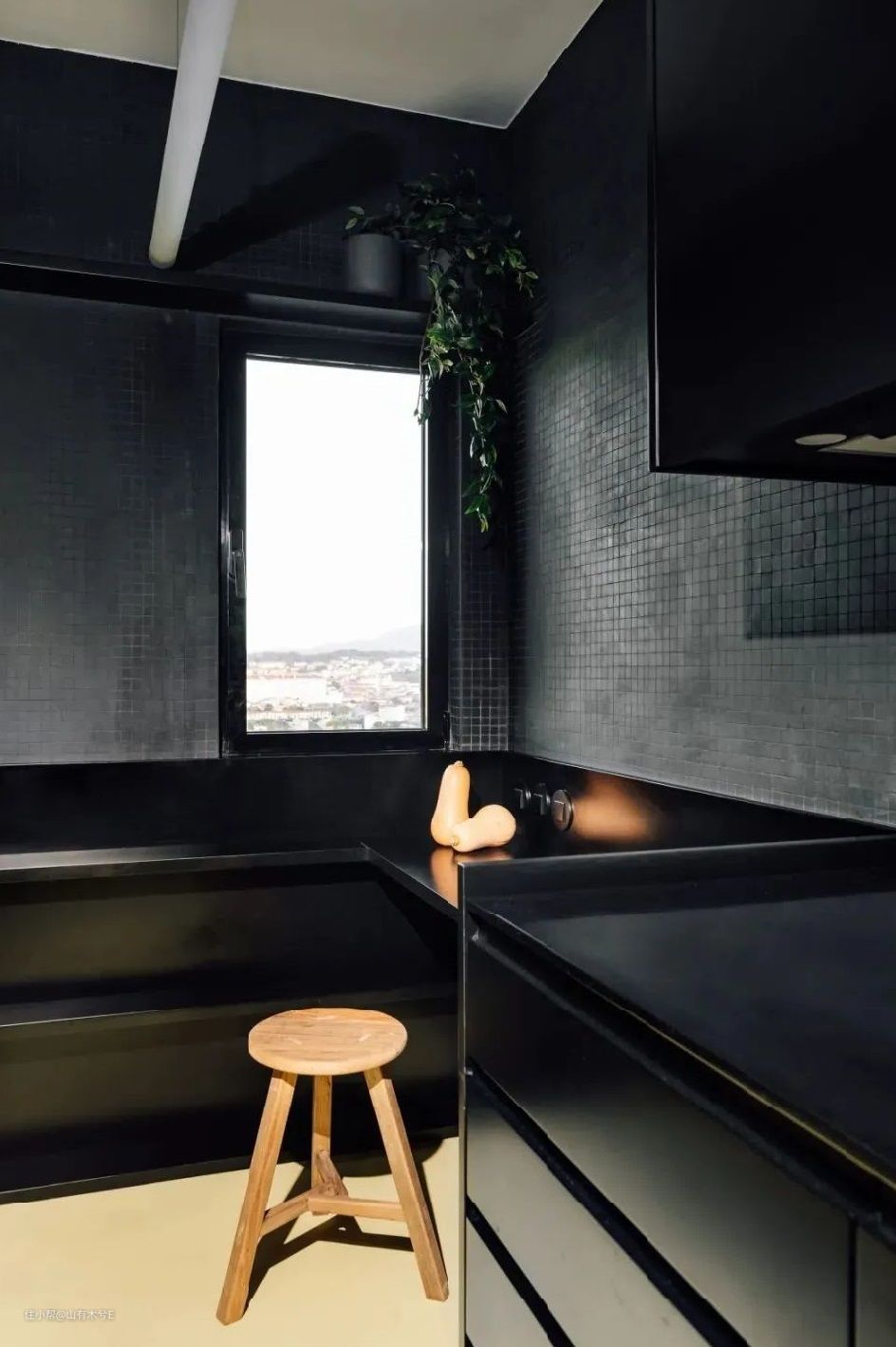原先的隔墙被拆除后,空间在视觉上得到了很好的放大感,利用黑色的窗帘进行隐私的保护,既符合空间整体的调性,都显得十分灵动。