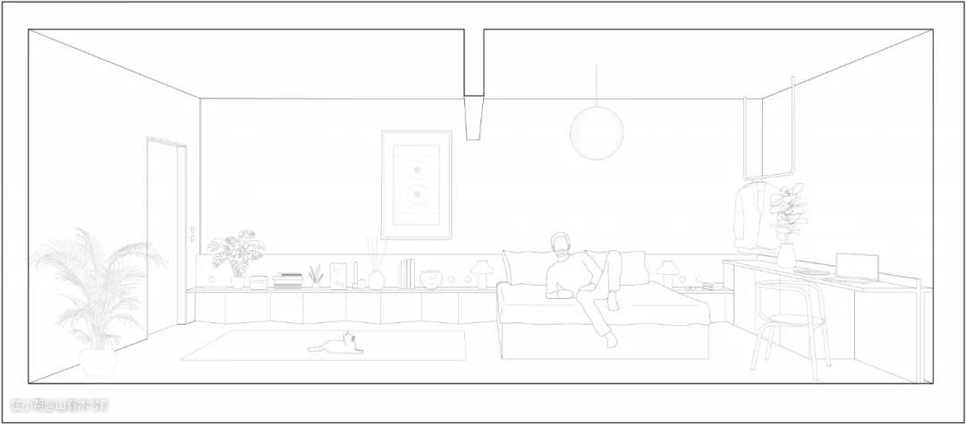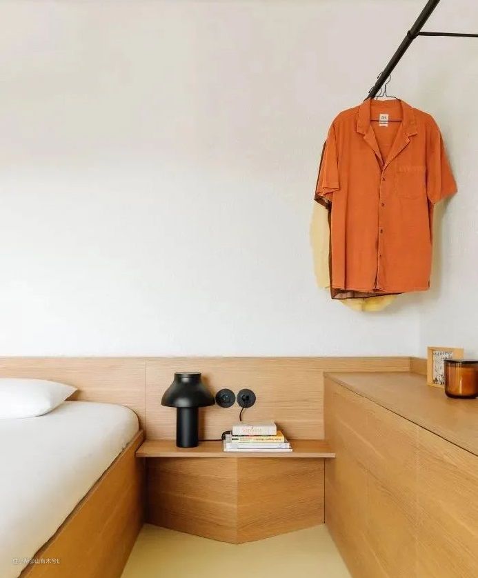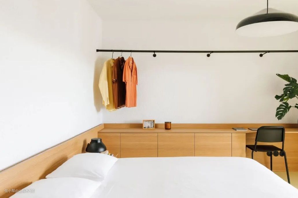 空间的另一侧设计师同样定制了一排地柜,用于物品的收纳,由于空间的用途是短期租赁,设计师并未规划厚重的大型衣柜,而是直接定制了一根金属管,将衣物直接悬挂在上方,看起来更加便捷和轻盈。