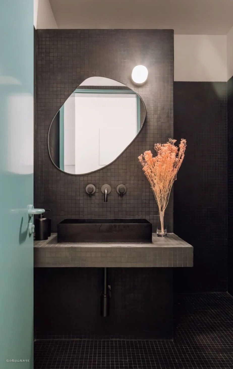 穿过蓝绿色的入口进入到洗浴室,内部的黑色装饰非常彰显个性,为了避免压抑感,不规则图形的镜子、壁灯以及花束都成为了点缀。