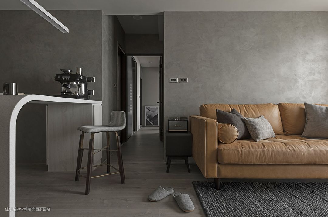 客厅改变以往电视墙為主角的定律,特意选用仿清水模涂料,使沙发背墙以乱纹表现不羈的粗矿感,成为了客厅的焦点。