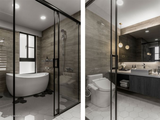 木纹砖包裹卫浴墙面,温暖了黑白灰所塑的沐浴时光,就连浴柜也改用深黑木纹,而六角砖由白至灰黑的渐层,巧妙划分乾湿区分界,也带动了色调的深浅变化。圆润弧形浴缸同样扮演平衡要角儿,柔化金属俐落姿态,设计师营造饭店式卫浴体验。