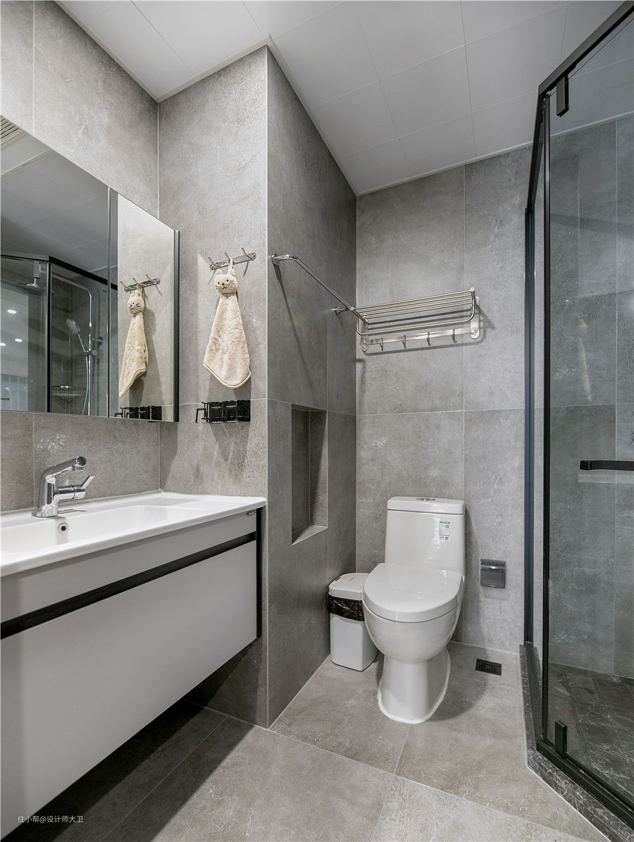 次卫是暗卫,台盆柜选用白色,能提亮整体空间,靠近马桶做了壁龛,可以存放一些纸跟用品。