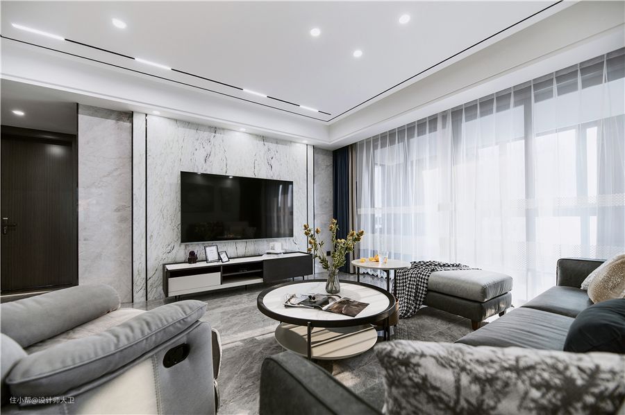客厅宽敞通透,黑白灰贯穿整个空间,开放式的布局跟大落地窗,让客厅采光充足,无主灯色设计,让整个空间看起来简洁干净,顶部筒灯跟磁吸线条灯进行照明,组合茶几,布艺沙发,装饰画在光影中调节着氛围。