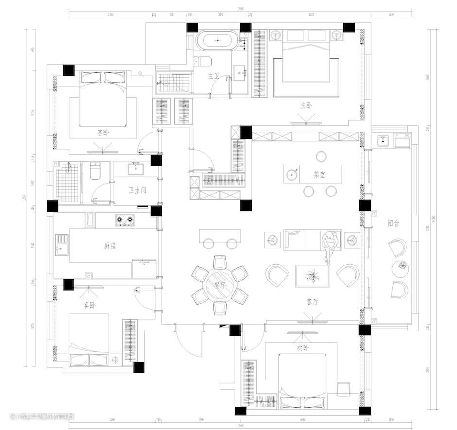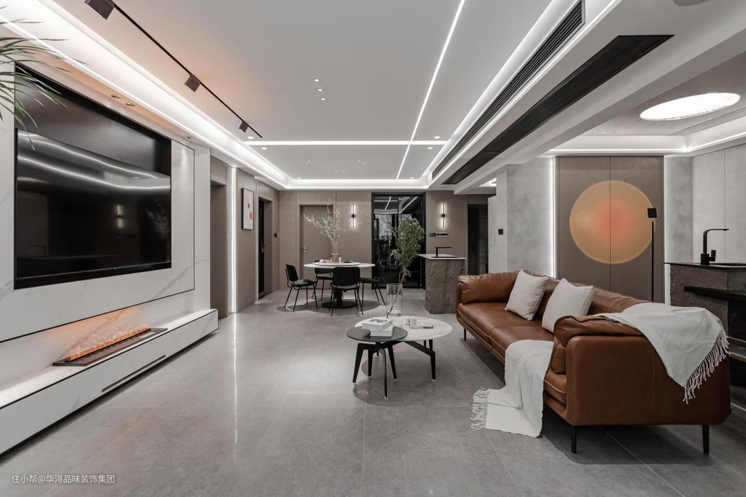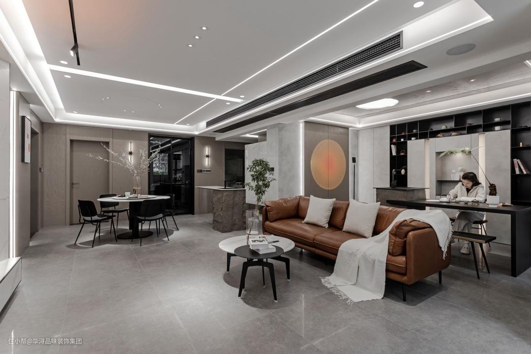 今天介绍的这款案例是以现代轻奢风格进行设计的,业主两人都喜欢超现代的设计理念,希望能够通过后期家装设计,让建筑内部整体呈现出一种潮流质感,让自己的新家也能走在时尚的前沿,亲朋好友来参观都能有一种非常醒目的感觉。 设计师了解业主的需求后,选用了现代轻奢风,采用无主灯的设计,线性灯带对房间内部进行拉伸,配合深灰色的轻奢色调,让整体空间干净美观,也得到了业主的肯定。 客厅、餐厅和茶室的综合功能区打造,使得室内的公共活动区域变得更加宽广,搭配上休闲阳台,让生活更为舒适。主卧拐角式的进门设计,能够更好的保护生活隐私。
