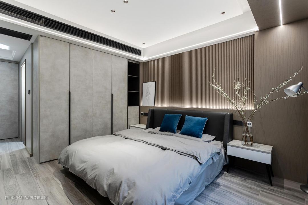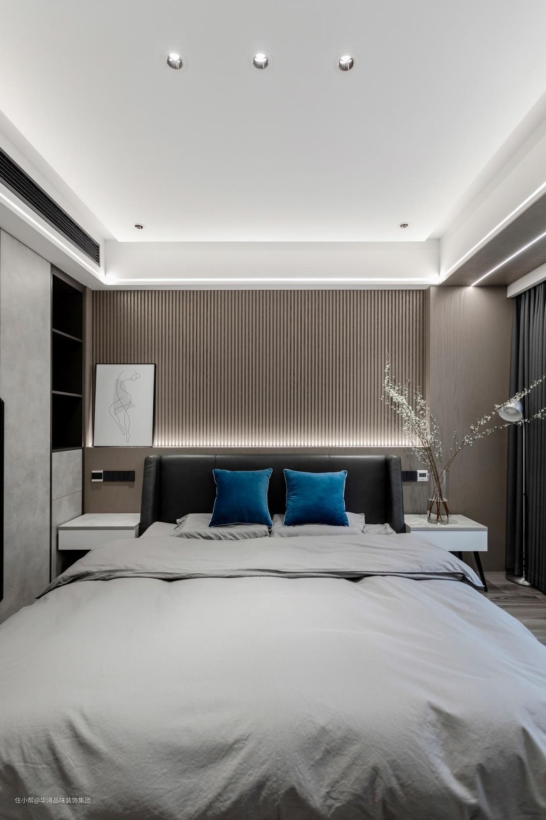主卧也是无灯设计,简单的吊顶搭配了射灯与灯带,避免了卧室层高的压迫。并且在床头一侧放置了一个小台灯,使主卧更显明亮。 主卧背景墙以竖条木质格纹为主要装饰,在左侧又放置了一幅线条感极强的现代装饰画,使整个主卧更具有动感,更具活力与简约。