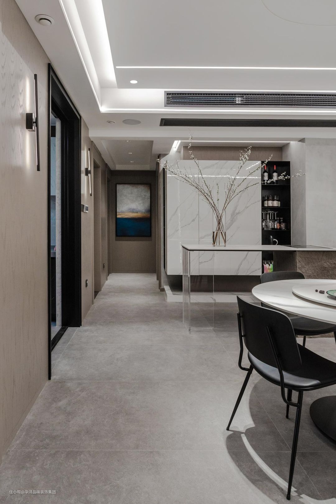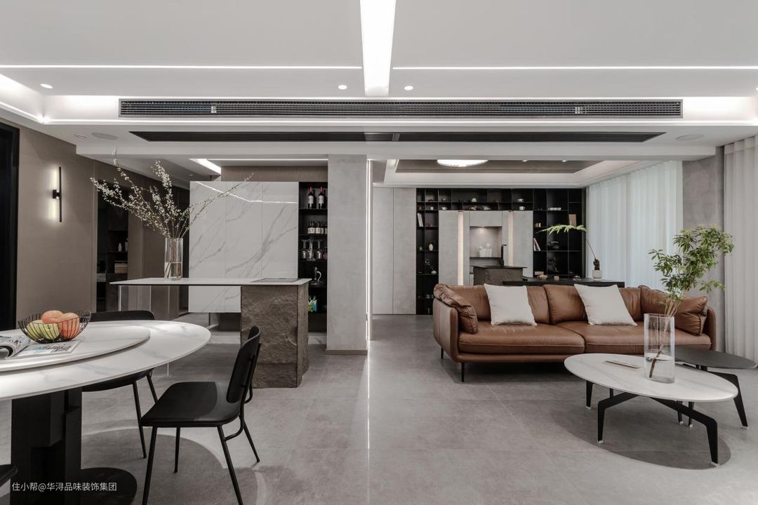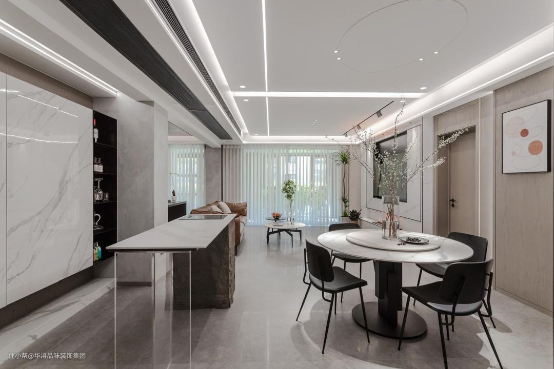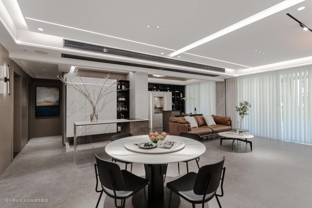 客餐厅作为一个整体,设计风格简约大气,同时在两个区域的细节处都有小的呼应,使客餐厅更好地作为一个家居区域。客餐厅的吊顶做了双层吊顶,设计了中央空调。