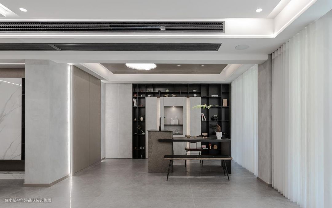 开放式书房的存在让整个客厅的功能性更为突出,窗帘选择了与客厅一致的白色窗帘,使整个书房更显别致优雅。在书桌的一侧设计洗手台,更加的便捷。 同时两边的座椅也更凸显书房的特色。在座椅后面打造了一整面墙的柜子,左侧是封闭式柜子,白色的柜门简单大气,右边主要是掏空式的摆放柜,以黑色系为主,简单时尚,又可以放置更多的收纳品和装饰品; 中间部分打造了白色雕塑式的突出位置,更显设计心思满满,让书房的整面墙独具特色,让书房更加具有文学氛围。这样设计的书房谁能不爱呢。