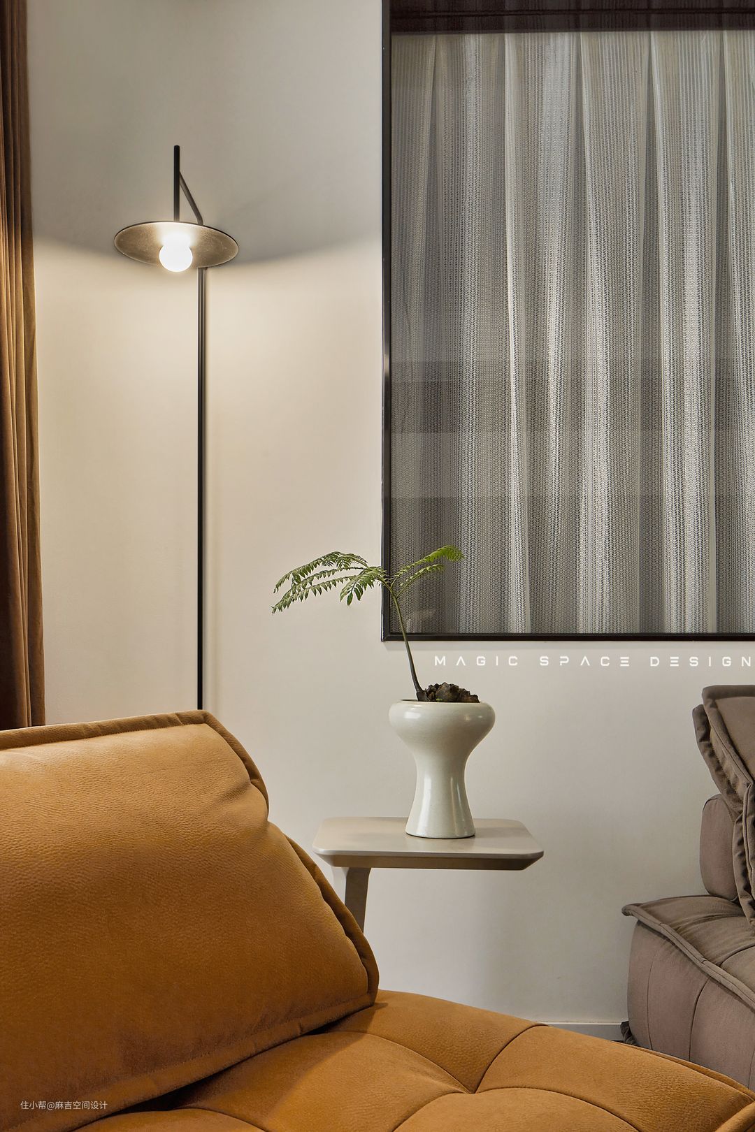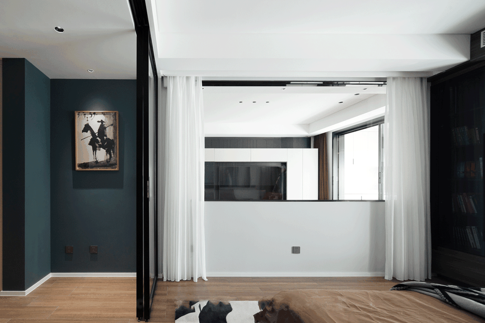 使用玻璃做为隔断,增加室内采光以及使空间显的更加通透,实现客厅空间与主卧空间相连通的效果,玻璃半墙增强空间氛围的视觉表现力,拉上纱窗就变成了属于自己的主卧空间,沉浸却不闭塞相对独立却又功能完善。
