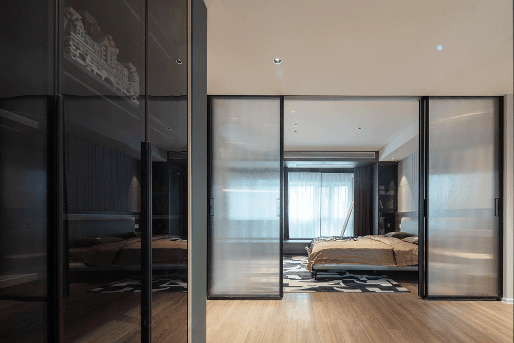 相较于客餐厅的狭长,卧室的轮廓线就非常的可观,衣帽间与主卧中间做了玻璃移门,根据需求密闭或互通,三边空间完全由玻璃材质隔断。