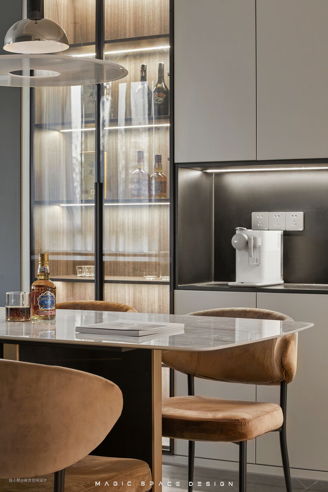餐厅加入了岛台的设计元素,搭配玻璃酒柜,使空间的氛围焕然一新,灯具的造型十分具有设计感。