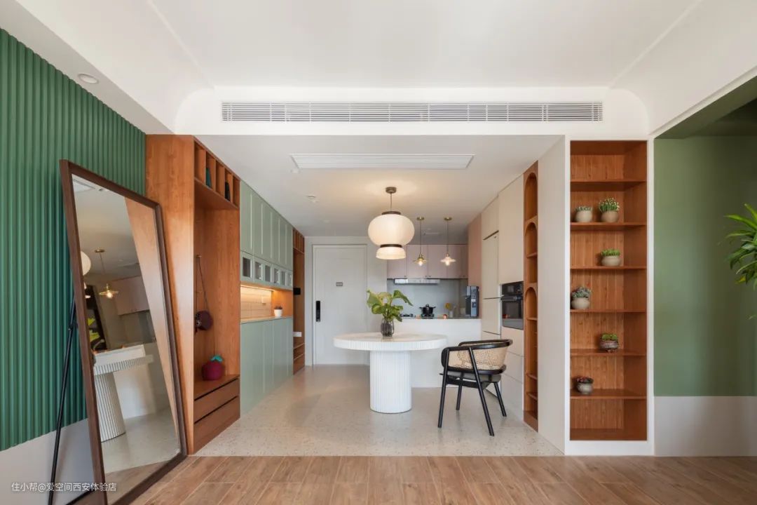 走廊自然采光欠缺,所以顶部增设暗灯打照。原木色地板+绿色墙壁+白色留白墙面,空间自然清新,拱形门更有线条美感,生动活泼。