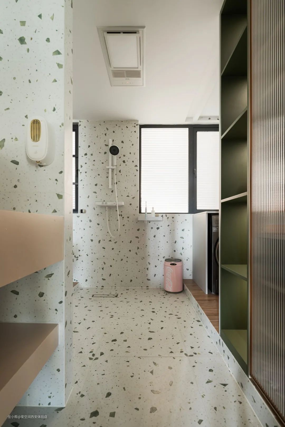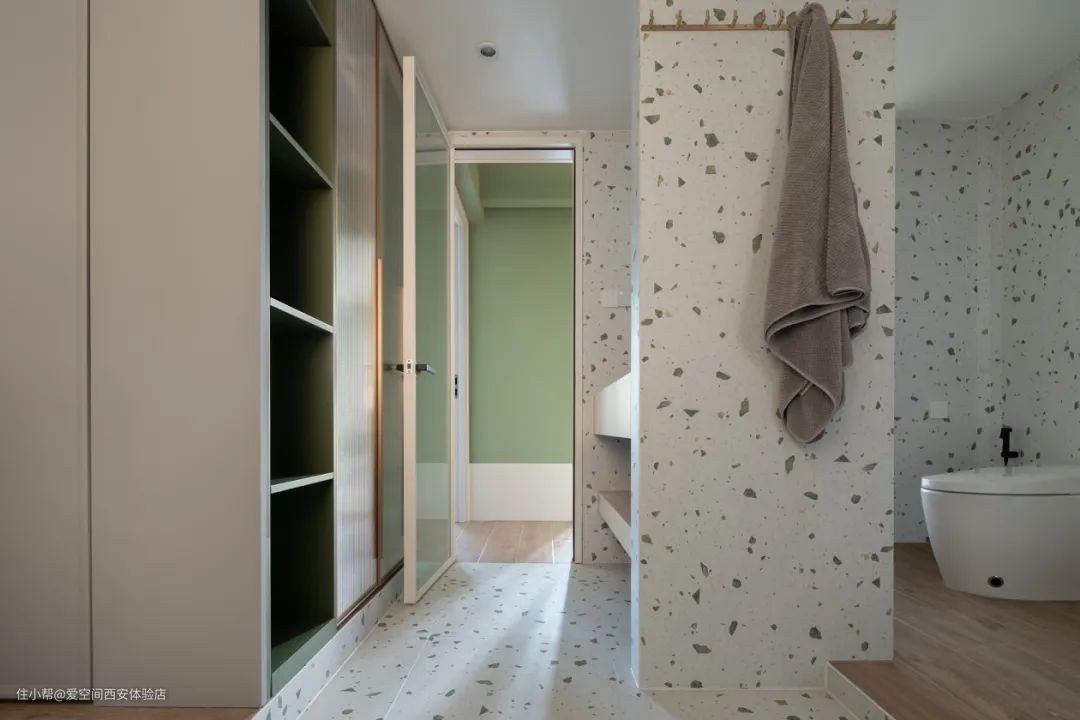 入门两侧是洗手池和收纳柜,洗手池处的收纳开放式设计,通透防潮很有空间感。靠墙收纳柜壁龛设计,空间利用率极高。粉色+绿色梦幻浪漫,超级温馨。