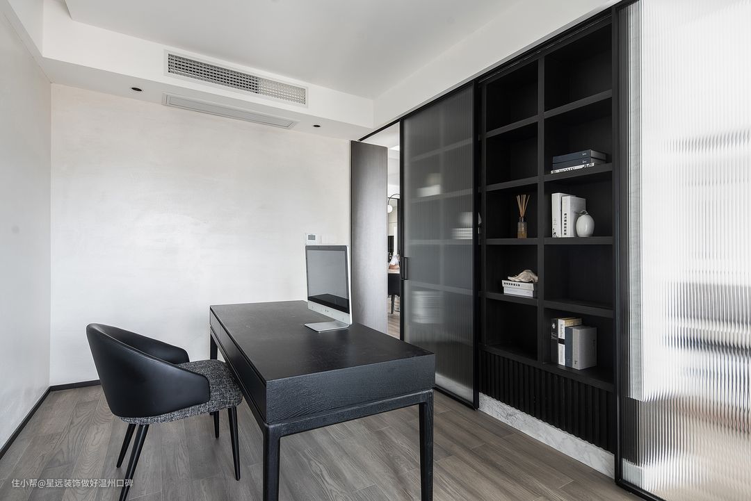 书房连接着阳台和客厅,通过对空间的合理规划,让电视机背景墙和书柜实现一体两面,在互通和独立之间做到双赢