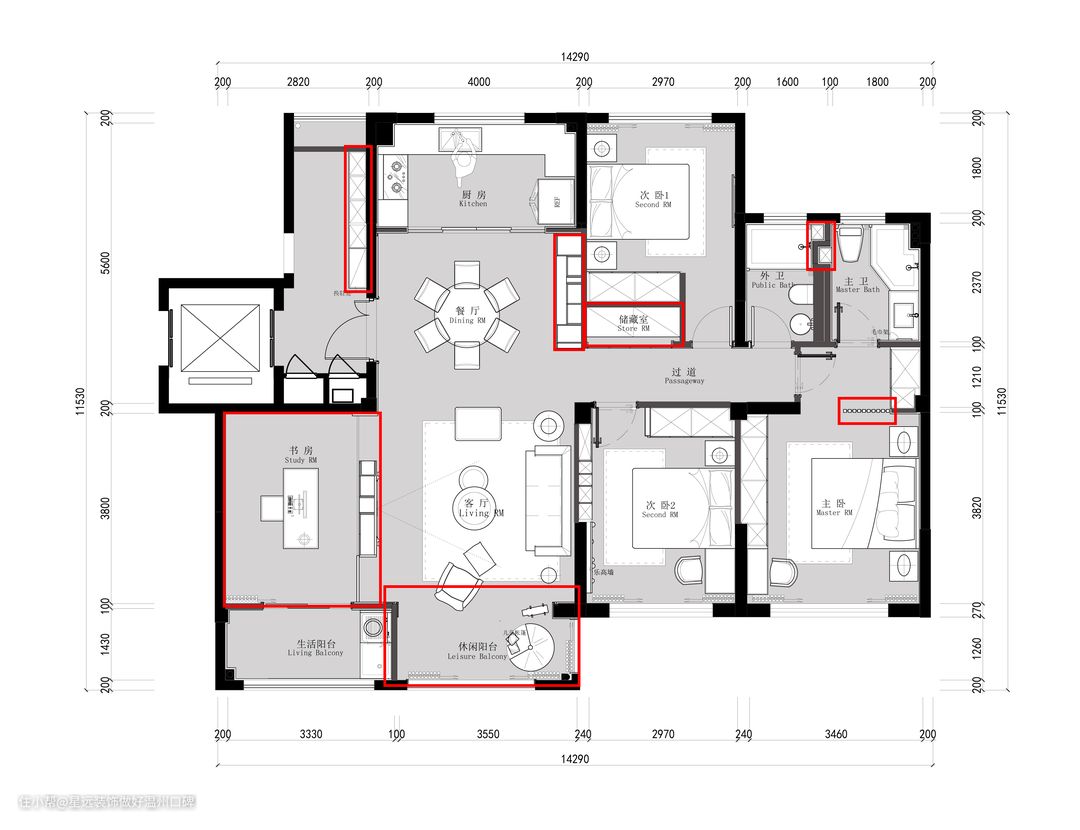 1.图纸上大框架其实没做大调,仅仅在北面房间这里增加了一个储藏室。 2.客厅部分,和阳台连一起来处理,因为孩子还小,所以这块区域作为孩子和家长的互动区。 3.公共区域的亮点主要还是和书房的处理手法上,电视机背景和书柜合一的处理。 4.主卧这里,由于户型不可避免的冲卫生间的门,所以这里增加了一个屏风。