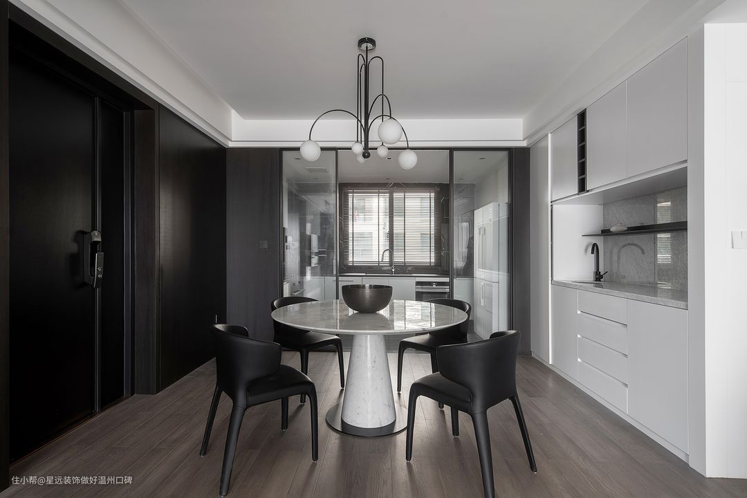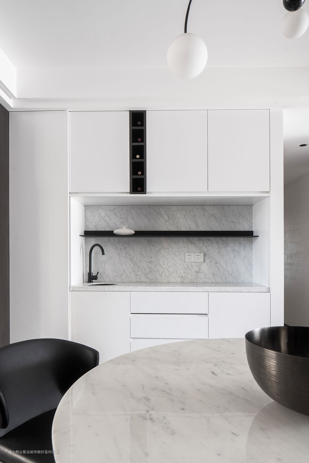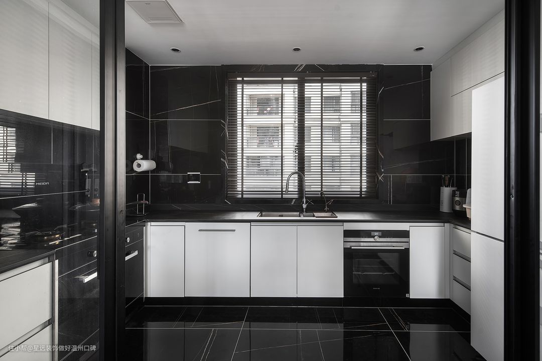 厨房空间将黑白的主色调进行到底,带出浓浓的现代风。 厨房拆除了原始的双墙,为了增加台面长度,墙体向外移动,使厨房使用功能得到提升,回字形操作台面让整个使用操作体验更好。