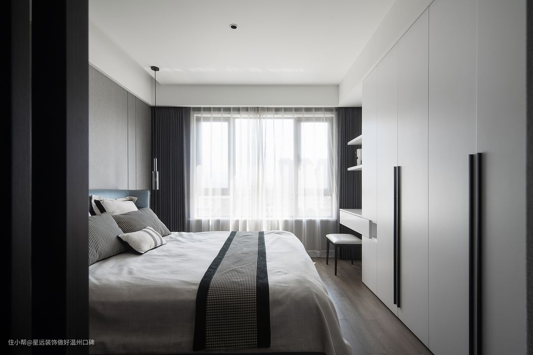 主卧的色调方面,由于业主说自己就喜欢这个床,那好吧,我只能根据他喜欢的床来配色,索性就用灰色背景来配合这个床的颜色,床尾衣柜的增加,增强了客户的储衣量,并且融合了梳妆台,这个是女业主比较喜欢的。