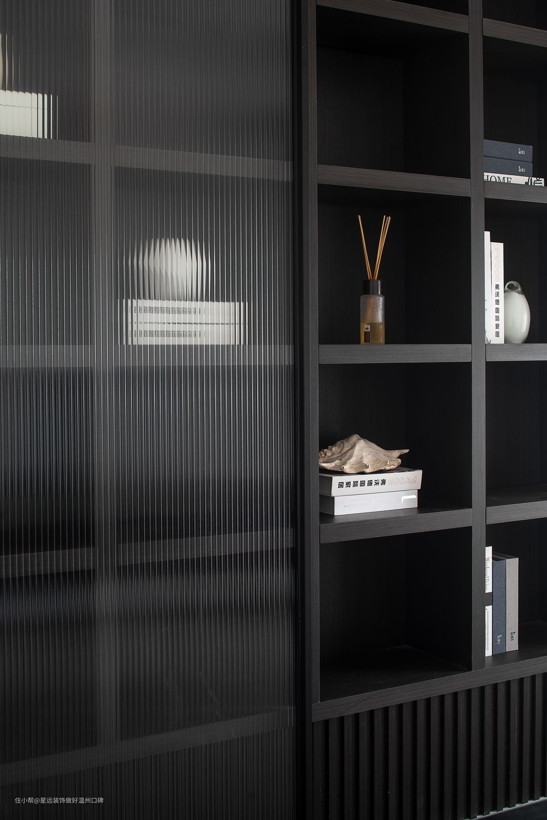 这里就是电视背后的书柜设计了。和电视背景完美结合,移门2个用途,平时可以作为书柜的门,为书柜防尘。想作为独立书房来用,那么这个移门就是空间的隔断门了