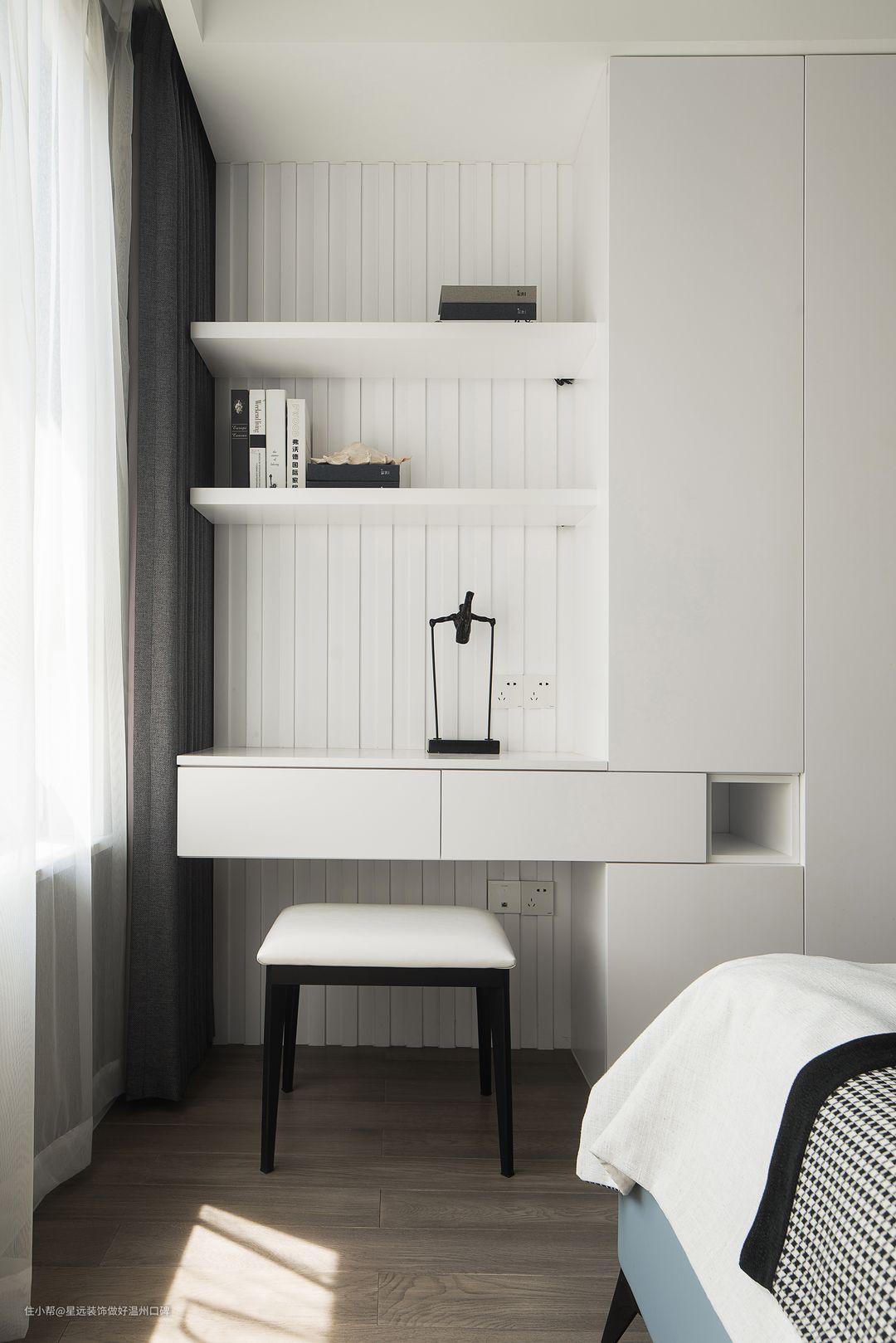 主卧由于户型原因,不可避免的会直冲卫生间的门,所以这里增加了一个屏风,这里其实还有点小心机,纯粹的作为屏风会感觉刻意,所以增加了挂临时衣物的功能。