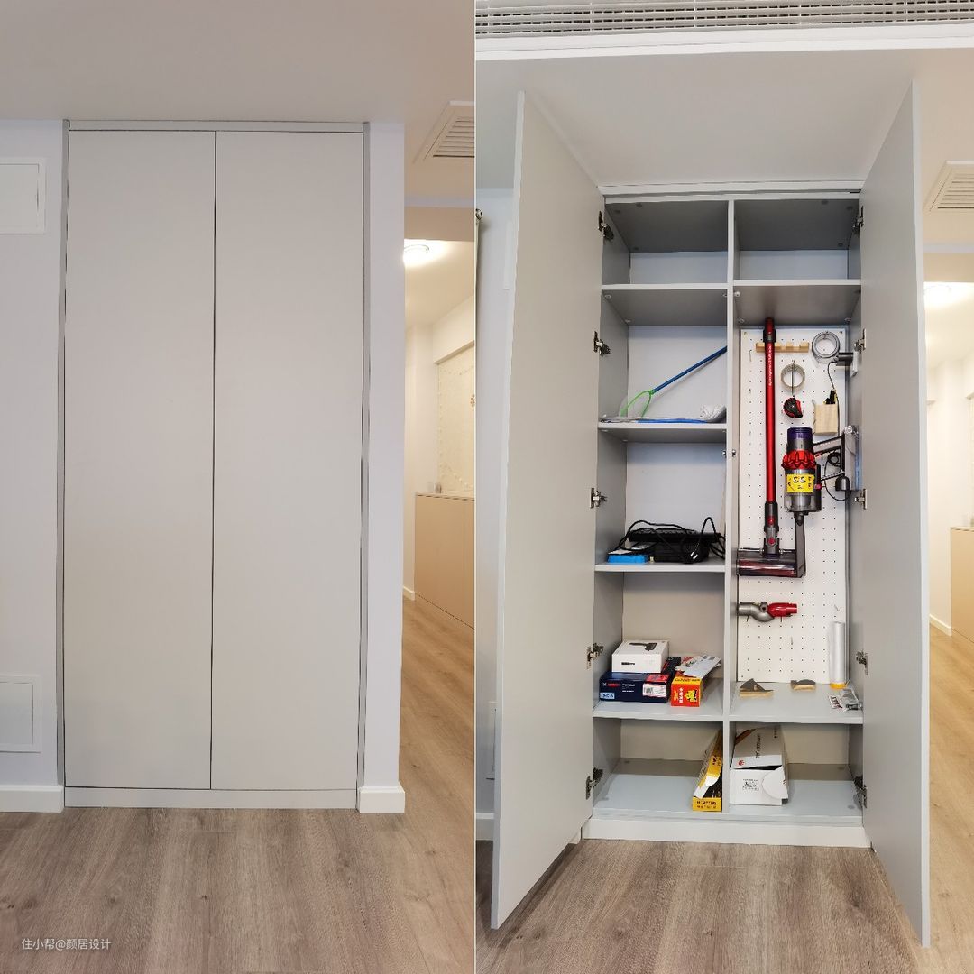设计师在这面墙内嵌了一组收纳柜,柜子中安装洞洞板,可以收纳日常生活中的各种小工具,真的超级实用。