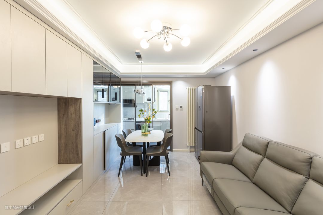 客餐厅整体为暖灰色调,沙发背景墙没有过多的装饰,大面积留白,让整个空间显得更加干净整洁。分子灯、筒灯加吊灯的光源组合,让空间氛围更有层次感。