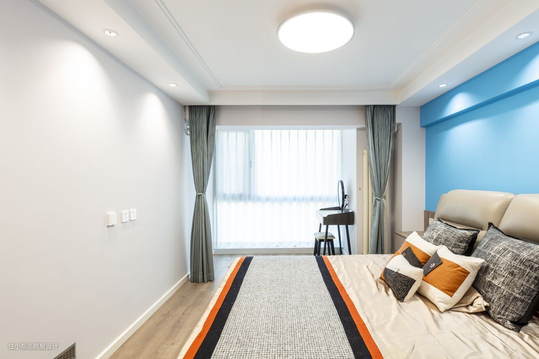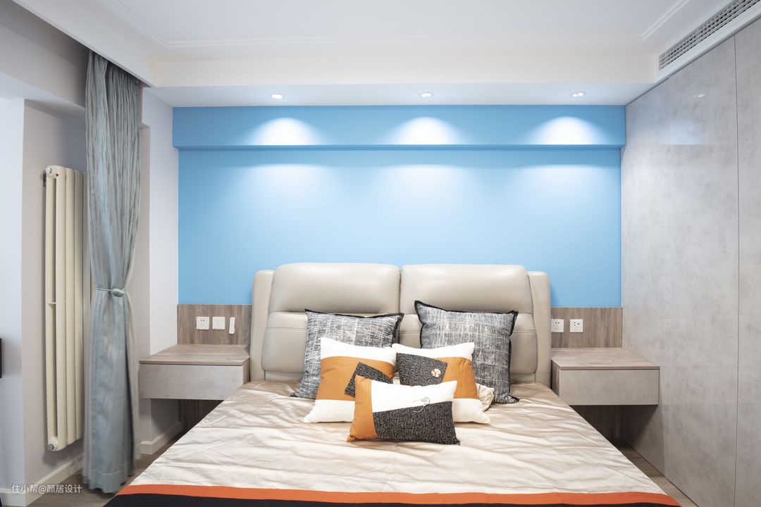 主卧灰色的软包床头,突显细腻的生活品质,淡蓝色的床头背景墙,澄澈明亮,让人眼前一亮。一体定制的悬空床头柜,和谐统一,也更方便日常打扫,无卫生死角。