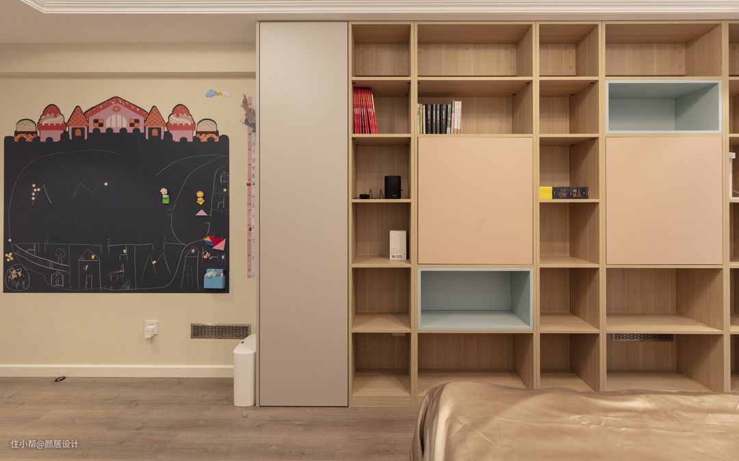 沿床尾的墙体,一边设计了涂鸦墙,让孩子用画笔来描绘属于她的童真世界,另一边定制了错落有致开放格的书柜,用于收纳女儿的📚画册,浅粉浅蓝色的点缀,充满了活泼灵动的气息。