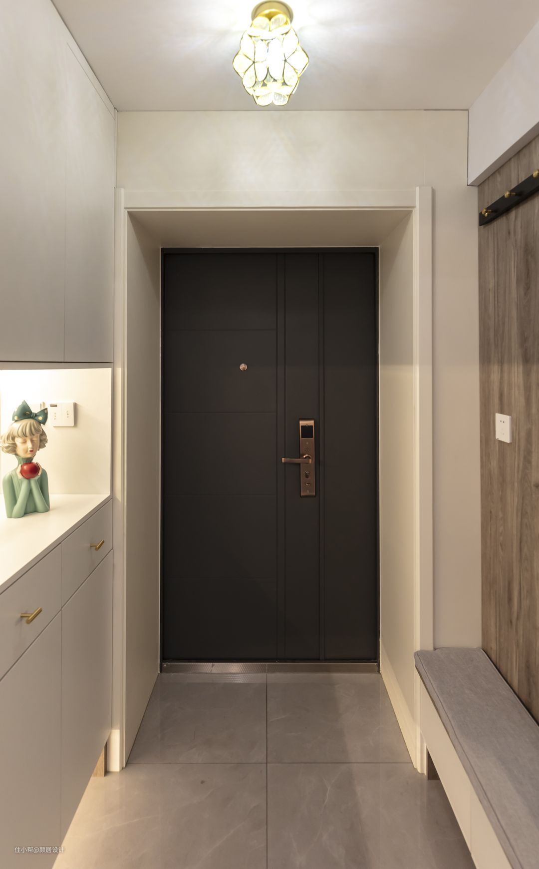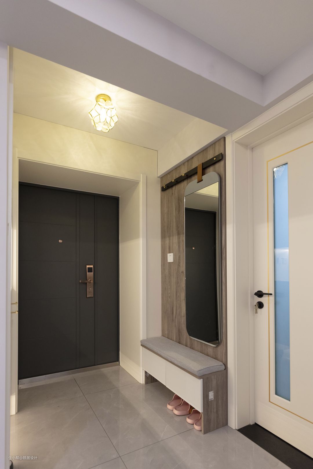 入户门的另一侧墙体,利用极窄的空间设计换鞋凳,换鞋凳与墙面背景一体成型,和谐统一。墙面吊挂穿衣镜,穿衣镜自带衣帽杆,榉木材质,黄铜挂钩,皮革挂袋设计,充满了文艺范。