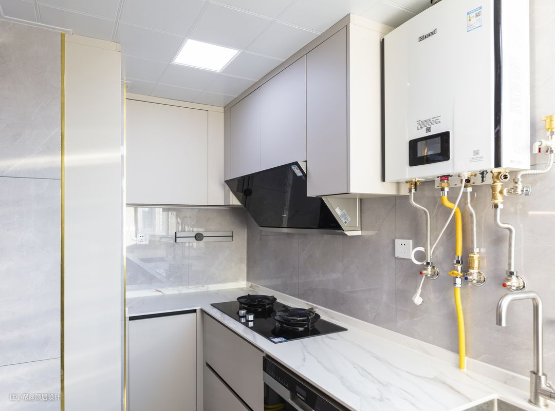 对于有老人的家庭,厨房是装修的重中之地,厨房是一个小U型厨房,靠边的位置设计了高柜,嵌入蒸烤一体箱,剩余橱柜空间遵循洗、切、炒的功能动线,合理规划布局。