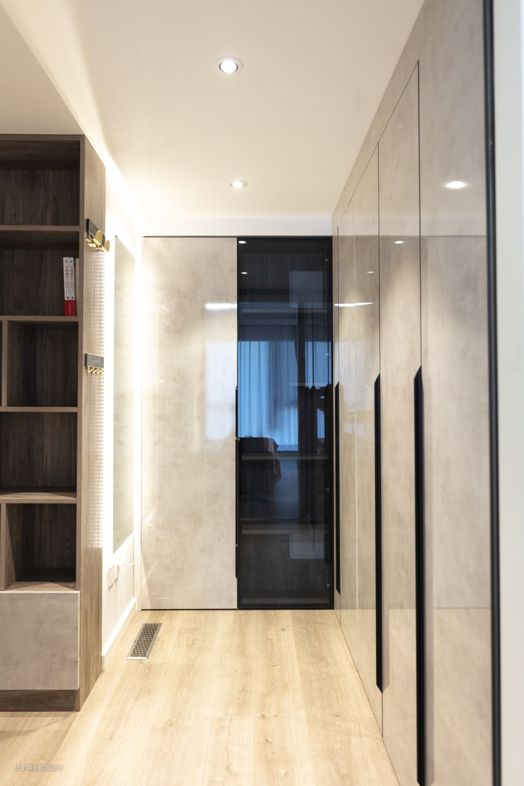 衣帽间是L型,定制了L型衣柜,由于房屋结构原因,正前方有一组柜体只能做薄柜,设计师设计成了黑色玻璃柜门,用作女主的包包收纳柜,展示女主各式各样的美丽包包,成为衣帽间一道靓丽风景线。