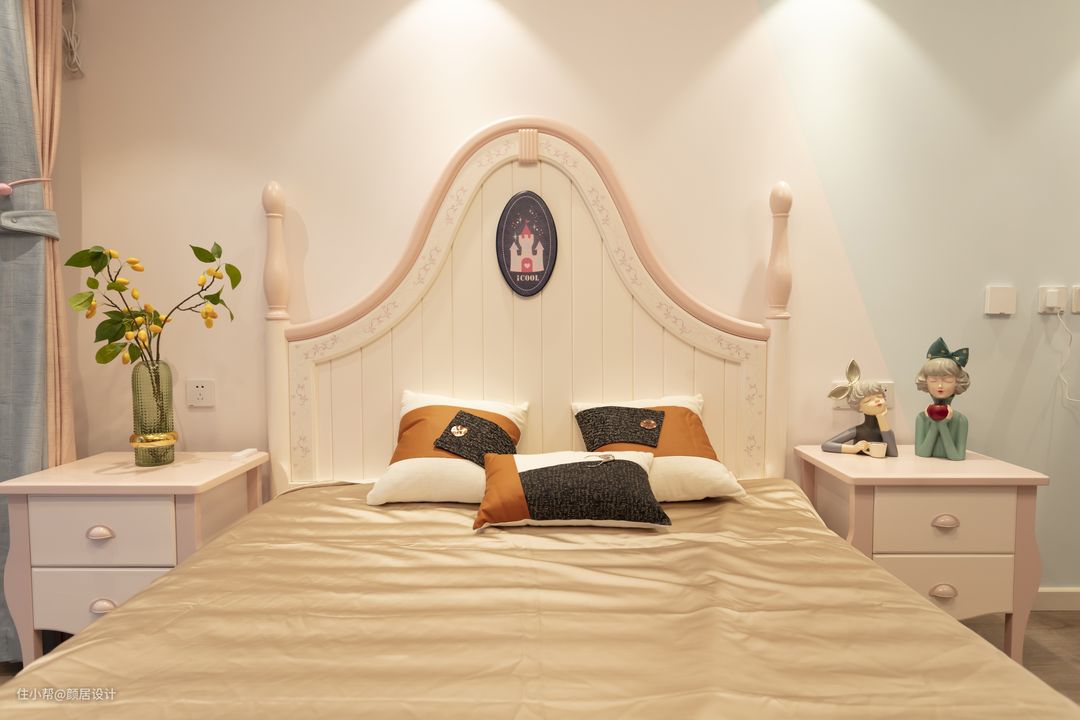 每个公主梦的女孩子,心里都会有一个粉色的梦幻世界,女儿房的墙面选择了淡粉和淡蓝的双拼色设计,搭配暖粉+雅白的床头和床头柜,满屋的高雅。