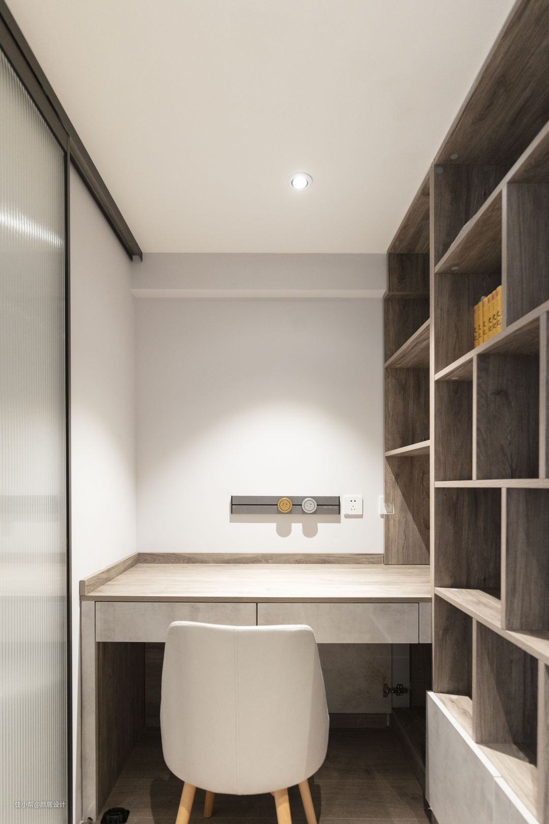 在衣帽间中还隐藏着一个小小书房,偶尔藏身于此,沉浸于阅读的快乐之中,也是一个不错的选择。
