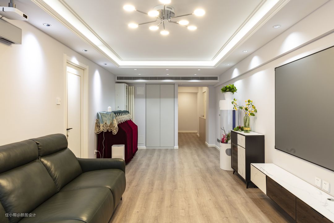 二楼客厅没有过多繁复的装饰,大面积的留白,通铺的木地板、悬空电视柜、极窄边框的画框幕布、墨绿色三人沙发,仅用几件成品家具来点缀整个空间,加上分子灯与筒灯的光源组合,让这个简约的空间百看不厌,越看越舒服。