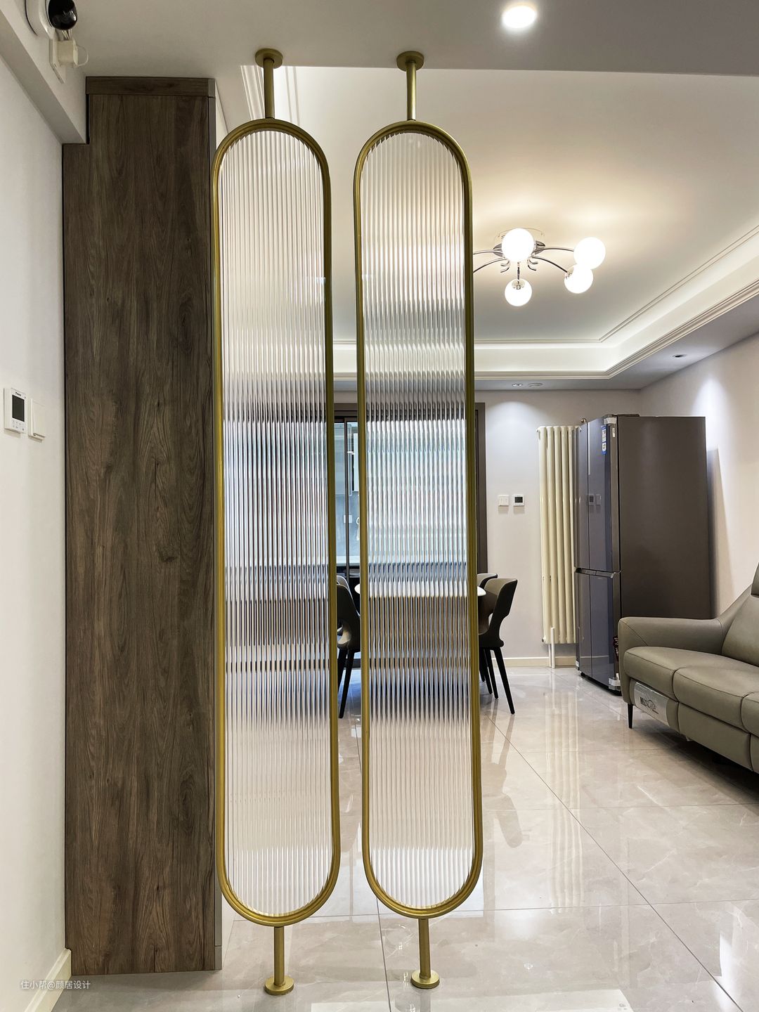 楼梯底部空间也合理利用,设计了四组抽拉柜,增加全屋的收纳空间。从客餐厅看向玄关,长虹玻璃屏风也是很美的,黄铜色的边框加上朦胧美的长虹玻璃,宛若一个高挑的美少女。