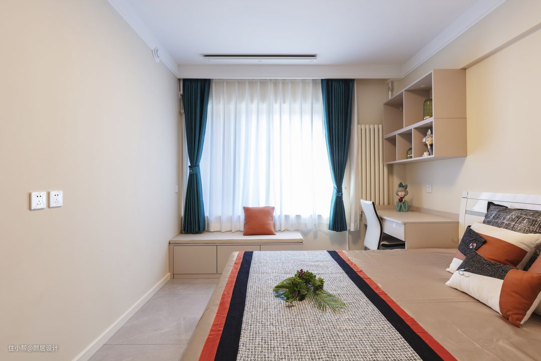 老人房以奶咖色为主色调,奶咖色是温暖的颜色,能够带来温馨舒适的家具氛围,蓝色窗帘与之相撞,使得整个空间清新脱俗。