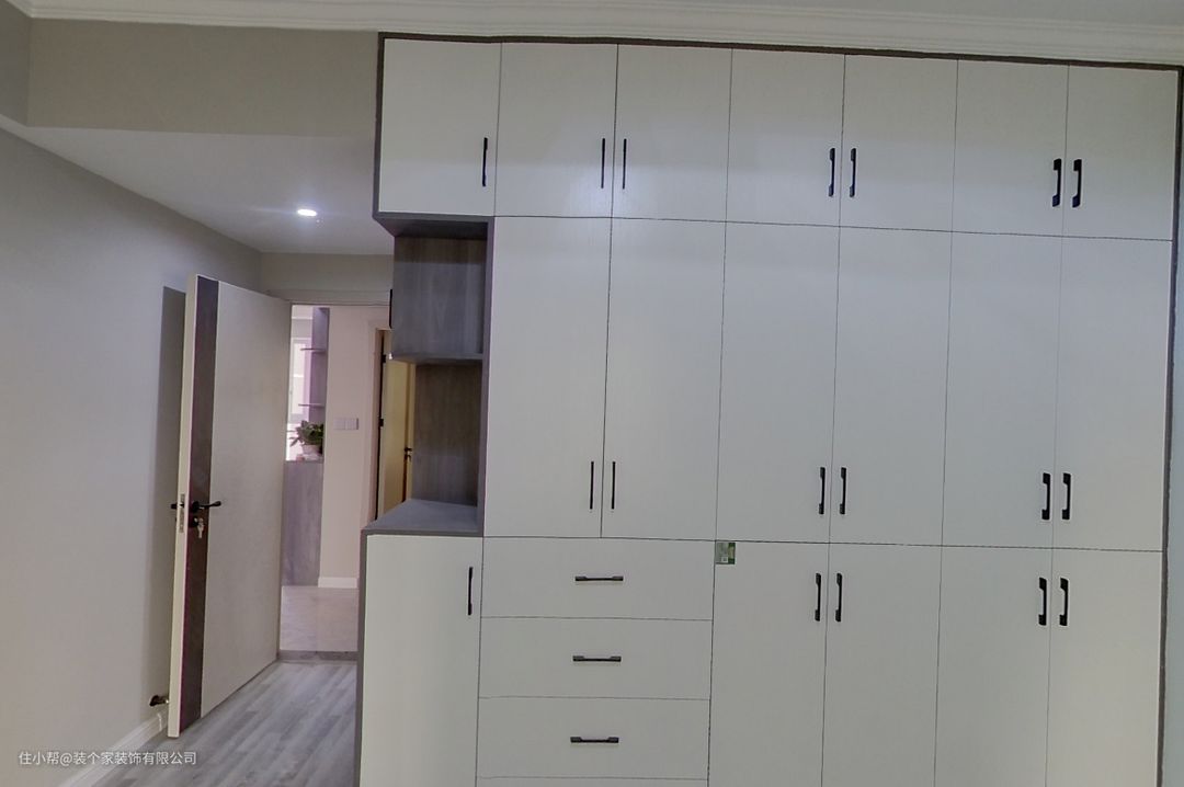 次卧当时拍摄的时候,很抱歉,灯光没有调节成白色的冷光,而是暖色光源,开上当天是阴天,所以整体拍出来就是这样的效果。他们家的衣柜是直接做到顶面的,整体也是非常难大气好用的。